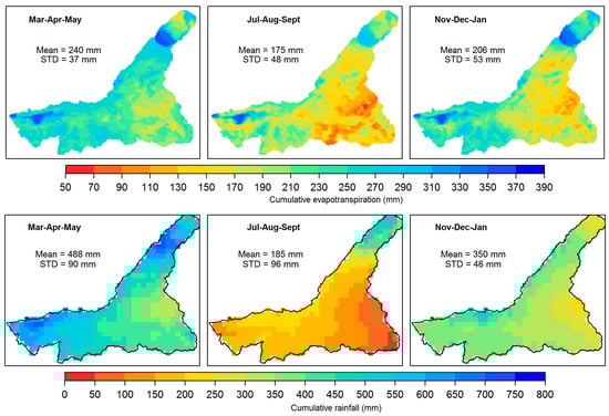 Figure 13 presents the aggregated ET (upper row) and rainfall (bottom row) during the main rainy season (March–May), the dry season (July–September) and the small rainy season (November–January) at 1- and 4-km scales, respectively. The seasonally-aggregated ET maps show not only the high heterogeneity of ET, but also its intra-annual variations that fairly match the rainfall patterns. The cumulated ET exceeds the cumulative rainfall for the dry season months (see Figure 13). This is ascribed to the availability soil moisture supply after the main rainy season and the water extraction by deep rooted vegetation. Generally, our results indicate that the eastern portion of the catchment has low ET fluxes, which is consistent with the low rainfall input and sparse vegetation cover in that part of the basin.