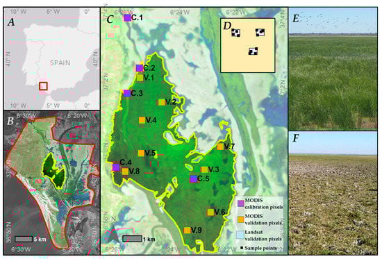(A) Location of the Doñana National Park in the southwest of Spain. (B) Location of the study area inside the Doñana National Park marsh. (C) Ground-truth biomass plots inside the study area. (D) Zoom to a MODIS validation pixel that exemplifies the sample design stratification. (E) Picture of the helophyte community (May 2016). (F) Picture of an area heavily grazed by cattle (June 2016).