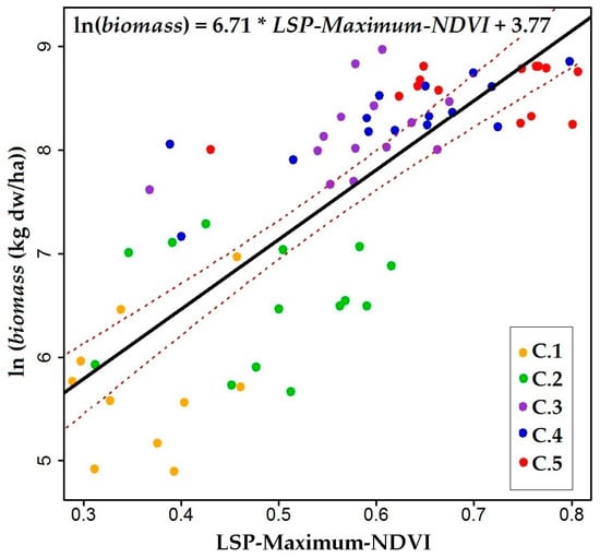 Model calibration. Relationship between the best NDVI estimator tested (LSP-Maximum-NDVI) and the logarithm of biomass production (kg dw/ha). Continuous line: regression line. Dotted lines: 95% confidence intervals. The dot colors represent the five different locations of the calibration biomass plots.
