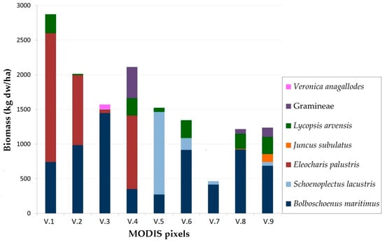 Biomass production varied considerably among validation plots, ranging from less than 500 kg dw/ha to almost 3000 kg dw/ha (mean = 1595 kg dw/ha, median = 1524 kg dw/ha, standard deviation = 678 kg dw/ha) (Figure 3). Species composition showed an unexpectedly high variation among sampling localities. B. maritimus represented 47% of the biomass production, followed by Eleocharis palustris (28%) and Scirpus lacustris (10%). B. maritimus was dominant in 5 of the 9 MODIS pixels, while the other 4 pixels were dominated by E. palustris (3 pixels) and S. lacustris (1 pixel).