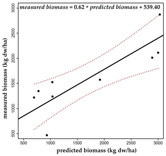 Variability in species composition did not significantly influence the relationship between measured and predicted biomass production. Results of the multiple regression model including LSP-Maximum-NDVI and the proportion of B. maritimus showed that the latter did not significantly influence biomass yield (Adj. R2 = 0.61 in contrast to R2 = 0.70; significance of proportion of B. maritimus t-test = −0.39, p-value = 0.71).