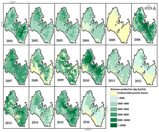 Based on our LSP-Maximum-NDVI model, we produced 16 maps representing biomass production per pixel (in kg dw/ha) for each growth season between 2001 and 2016 (Figure 5). The average value per pixel (across all years) was 3869 ± 1781 kg dw/ha. The maps reveal a high spatial variation in biomass production, resulting from a combination of high spatial heterogeneity and high inter-annual variation. In some years, such as 2010, there were extensive areas with high biomass production (up to 10,000 kg dw/ha); while in other years, such as 2005, biomass production was one order of magnitude lower (i.e., it did not reach 1000 kg dw/ha at any pixel across the study area). However, the areas with high and low biomass production were not stationary, but strongly varied among years. For example, in 2001 biomass production peaked at the southern part of the study area, while in 2010 it peaked at its northernmost part.