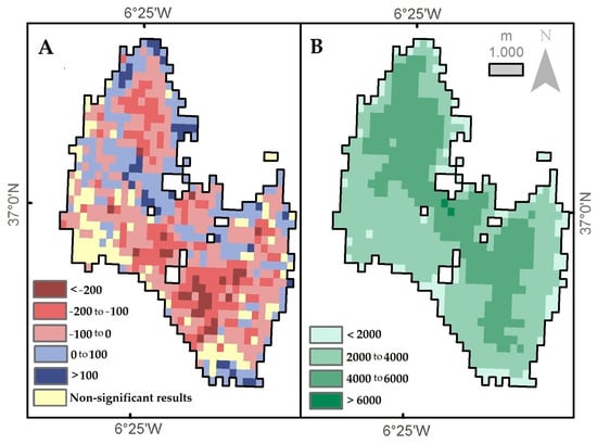 Values of the Theil-Sen slope estimator showed that there is a general trend towards diminishing biomass production over the last 16 years—i.e., there were more areas where biomass production decreased than areas where it increased (Figure 6A). Biomass production tended to decrease in the central part of the study area, whereas it tended to increase in its periphery. A comparison with the spatial distribution of the average biomass production from 2001 to 2016 revealed that biomass production tended to decrease in areas with high productivity (high average biomass production) and to increase in areas with low productivity (low average biomass production) (Figure 6A,B) (R = −0.24, t-test (725) = −6.51, p-value = 1.38 × 10−10). Disentangling the causes behind this pattern probably deserves further analyses.