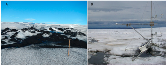 Photographs of the Vatnajökull ice cap. (A) Volcanic tephra in the ablation area (photograph taken on 6 September 2014); (B) AWS tunmi in mid-summer 2001, showing water channels beneath the radiometer causing small scale variability in albedo.