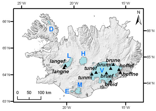 Map of Iceland showing the location of the AWSs on the Vatnajökull (brune, brumi, bruef, breid, tunef, tunmi, hoffef, hoffne) and Langjökull (langef, langne) ice caps. The main ice caps are labeled with a blue capital letter (D: Drangajökull, E: Eyjafjallajökull, H: Hofsjökull, L: Langjökull, M: Mýrdalsjökull, V: Vatnajökull).