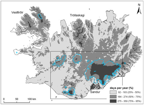 Mean annual number of days with missing data during the period 2001–2012 in the MCD43A3 product. The black rectangle indicates the subset used in Section 3.4. The blue lines show the extent of the ice cap from the Corine Land Cover 2006 in Iceland.