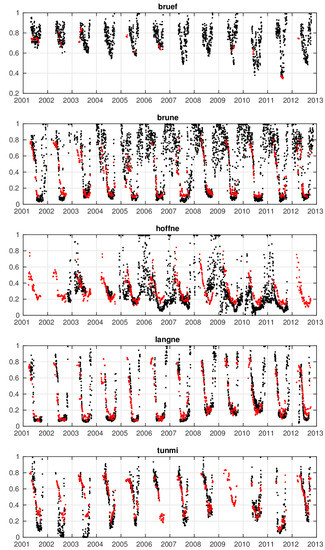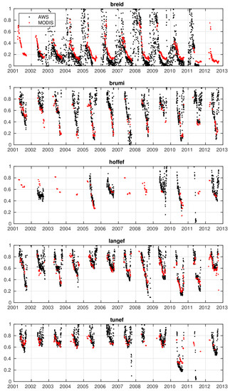 We used the latest version of the MODIS (Aqua/Terra combined) MCD43A albedo product V006 [15] (released in late 2015). Only MODIS tile h17v02 was used, as it covers the entire study area. We extracted the black-sky and white-sky broadband shortwave albedo values in every MODIS granule (one per day) between 1 January 2001 and 31 December 2012 at the 10 AWS locations using the gdallocationinfo utility of the Geospatial Data Abstraction Library [25]. The black-sky albedo is the directional-hemispherical reflectance, i.e., albedo in the absence of diffuse illumination, while the white-sky albedo is the bi-hemispherical reflectance, i.e., albedo in the absence of direct illumination. We accounted for the horizontal displacement of the AWS due to glacier flow by using coordinates that were measured every year in summer at each AWS (see Section 2.2). Missing annual coordinates values (8%) were filled by the average of the other years’ coordinates for each AWS. As recommended by the data provider [15,26], the data were discarded if the solar zenith angle is higher than 70° at the time of the latest MODIS acquisition. Before 02 July 2002, the MODIS sensor was only onboard the Terra platform, hence the acquisition time is around 10:30 in local solar time (LT). After that date the acquisition time is given by Aqua overpass time (13:30 LT). The data that were flagged as bad quality retrievals in the MODIS product ancillary files were not removed to maximize the number of observations. These quality flags are very conservative and lead to a strong reduction of the number of observations if flagged data are removed (about ten times less values, up to zero data at one station). This would make the data barely useful for our long-term goal, which is to provide the albedo maps in a surface energy balance model applied on Icelandic glaciers. For the comparison with AWS data, we computed the actual or “blue-sky” albedo as the average between the black-sky albedo and the white-sky albedo assuming a constant fraction of diffuse illumination as done by [8]. In any case, the differences between the two albedo values are very low in high-latitude regions [8,17]. In our study area the relative differences are lower than 5%.