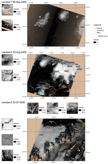To study the effect of the subpixel variability on the accuracy of the MODIS retrieval, we used the Landsat surface reflectance data from the United States Geological Survey. These images provide the surface reflectance at 30 m resolution for each Landsat spectral band after atmospheric correction. The surface reflectance values were converted to broadband albedo values using a narrowband-to-broadband albedo conversion for glacier ice and snow based on band 2 and band 4 [31]. This empirical formula was obtained from airborne measurements performed over Vatnajökull and Greenland [31].