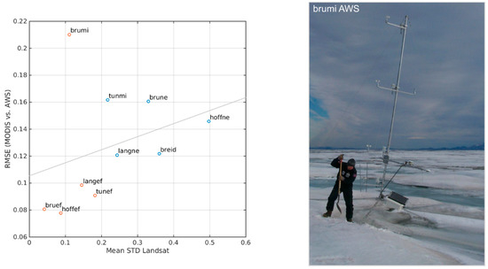 Scatter plot of the RMSE obtained by the comparison of the MODIS albedo with the in situ data (Section 3.1) versus the mean of the standard deviations of the Landsat albedo that were sampled within the extent of a MODIS pixel. The mean STD was obtained by averaging the standard deviations computed for every combination of Landsat and AWS in Table 2. The color of the circles indicates if the AWS are in the accumulation area (red) or in the ablation area (blue). The photograph shows the brumi AWS during field maintenance on 24 Sepember 2001.