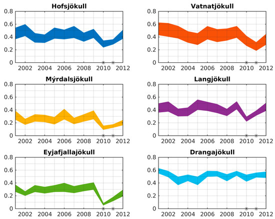 Evolution of the mean summer albedo over the main ice caps (July–August) from 2001 to 2012. Each curve is centered on the mean annual summer albedo, which was computed by spatially averaging the annual summer albedo composites within the corresponding ice cap area (Section 2.1). The spread corresponds to the standard deviation of the same pixel values and therefore indicate the spatial variability of the summer albedo composites. The stars indicate the years of the Eyjafjallajökull and Grímsvötn eruptions.