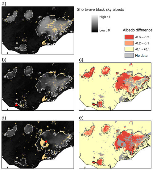 - Möller, R.; Möller, M.; Björnsson, H.; Guðmundsson, S.; Pálsson, F.; Oddsson, B.; Kukla, P.A.; Schneider, C. MODIS-derived albedo changes of Vatnajökull (Iceland) due to tephra deposition from the 2004 Grímsvötn eruption. Int. J. Appl. Earth Obs. Geoinf. 2014, 26, 256–269. [Google Scholar] [CrossRef]