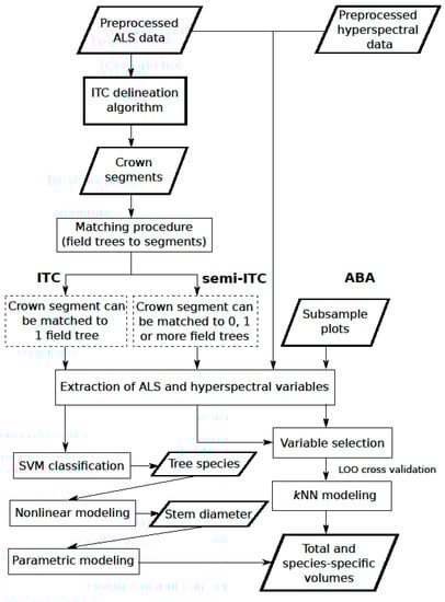 The flowchart for the species-specific volume prediction for the three remote sensing inventory approaches using ALS and hyperspectral data is presented in Figure 1. For the ITC approach, the predicted volumes were summed per plot and scaled to m3 per hectare, and for the semi-ITC and ABA approaches, the volumes were scaled to per-hectare values before modelling. In the case of the ITC and semi-ITC approaches, ALS and hyperspectral variables were calculated for each crown segment, whereas for the ABA variables, they were calculated for each subsample plot (sample plot halves). In the ITC approach, the tree species and DBH were predicted per segment. Subsequently, the allometric models were applied to predict species-specific volumes, which were summed up to have the total volume. For the semi-ITC approach and the ABA, the total and species-specific volumes were predicted simultaneously by a non-parametric multivariate kNN method using leave-one-out (LOO) cross-validation at the plot level.