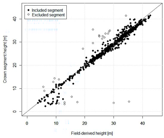 The ITC approach assumes that each delineated crown segment contains one field tree. The matching procedure of the crown segments and field trees was different from the classical methods [34,47]. An empirical threshold for the permitted distance (horizontal or vertical) between the “matched” crown segment and field tree was avoided. In particular, each segment was matched to the closest field tree according to a 3D distance. To confirm a good match, we fitted a simple linear regression with the field tree height as response (h) and crown segment maximum height as predictor ():