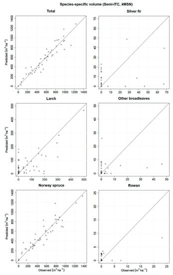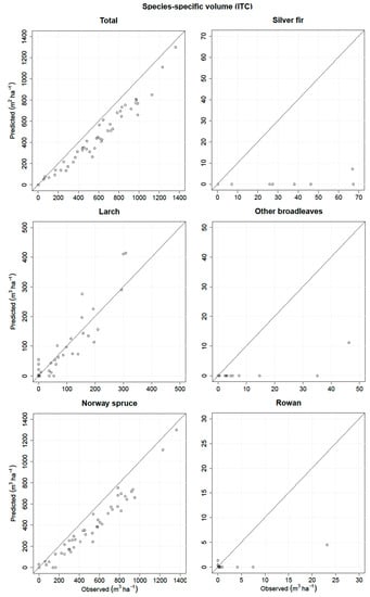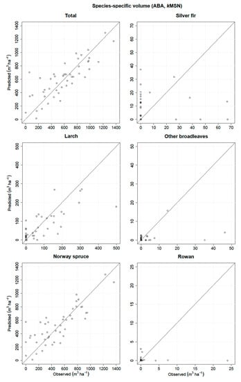 Observed versus predicted species-specific volumes at the plot level derived from the area based approach (ABA) method.
