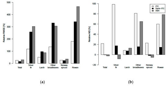 (a) Relative RMSEs and (b) relative MDs of the total and five species classes’ volumes obtained by the three inventory approaches: ITC, semi-ITC, and ABA.