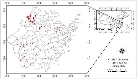 The MBF flux measurement site is located in Anji County, northwest of Zhejiang Province (30.46°N, 119.66°E). This area has a subtropical monsoon climate with distinct seasons and abundant rainfall; the average January temperature is 2.5 °C, the average July temperature is 27.8 °C, and the average annual precipitation is 1400 mm. The MBF is widely distributed across Anji County, covering an area of 335,484 ha, which accounts for approximately 45% of the total forested area. The area (1 km × 1 km) around the flux tower consists of the MBF. The average diameter of the bamboo at breast height is 9.3 cm, and the canopy height is 12–18 m, with a sparse understory of shrubs and herbs. The Moso bamboo shoots begin to break out from the soil in early March, and the high-growth stage is completed after two to three months [35]. The leaf expansion period of new bamboo starts during the late high-growth stage and is completed within 30 to 40 days [36]. New Moso bamboo changes its leaves in the second year and then every two years after the first leaf changing period [37].