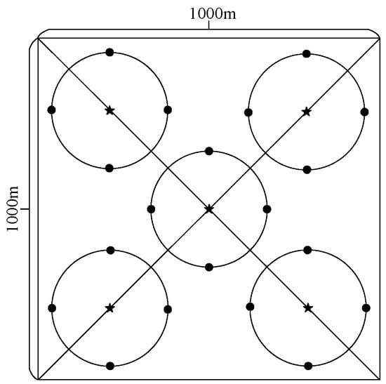 Ground LAI data were collected at the two flux sites for each month. The LAI time series of the MBF extended from spring 2014 to the end of 2015, while that of the LBF extended from winter 2014 to the end of 2015. The LAI was calculated using the LAI (2000G)-LogCI algorithm in the WinSCANOPY v2009a (Regent Instruments Inc., Québec, QC, Canada), based on the canopy images taken in the field using a digital camera with a fish-eye lens. Taking the flux tower as the centre, five observation centres (star in Figure 2) were set across an area of 1 km × 1 km. The LAI of each observation centre was calculated by averaging the LAI observations at the observation centre and in four directions (east, south, west, and north) (black point in Figure 2). Finally, the average value of the five observation centres was calculated as the actual LAI. The plot design of the LAI measurements is shown in Figure 2.