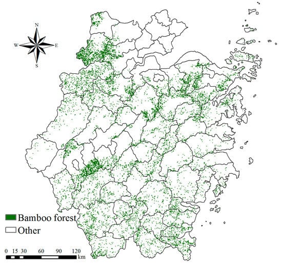 The bamboo forest distribution was extracted from pre-processed Landsat 8 OLI data using the maximum likelihood method. The training samples included data from 234 fixed plots from the Forest Resources Inventory in Zhejiang Province and 157 investigation plots, as shown in Figure 1. The bamboo forest information was extracted and resampled into pixel sizes of 1 km × 1 km for matching the resolution of MOD09A1 datasets. See [47] for land cover information extracted using Landsat data and the scale transformation method. The extracted bamboo forest map is shown in Figure 3. The map provided accurate locations of the bamboo forest for assimilating the LAI of the bamboo forest in Zhejiang Province.