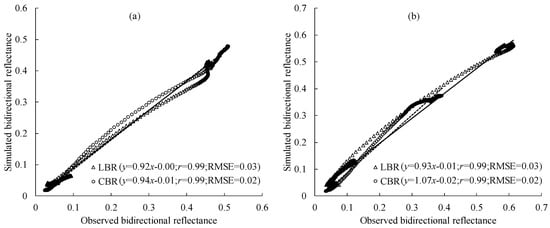 The scatter of observed and simulated bidirectional reflectance in the MBF (a) and LBF (b).