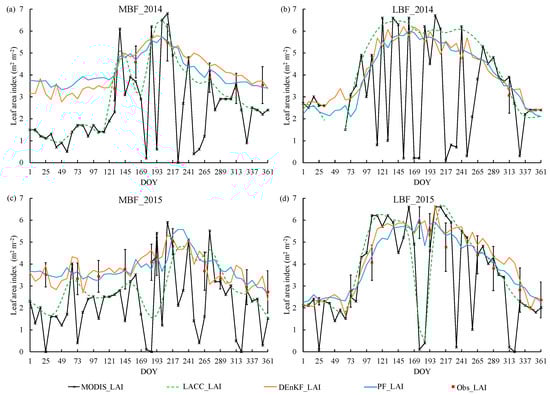 Time series of Obs_LAI, MODIS_LAI and LACC_LAI, DEnKF_LAI and PF_LAI of MBF in 2014 (a) and 2015 (c), and those of LBF in 2014 (b) and 2015 (d).