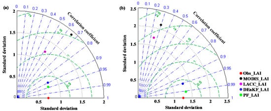 Taylor diagram between Obs_LAI and other LAI data (MODIS_LAI, LACC_LAI, DEnKF_LAI, and PF_LAI) in (a) MBF and (b) LBF. The radial distance from the origin (black dotted line) is proportional to the standard deviation of the estimate normalized by the standard deviation of the observations, the azimuthal (blue dotted line) position gives the correlation coefficient, and the radial distance from the reference point (green dotted line) is proportional to the centred RMSE difference between the observed and other LAI time series.