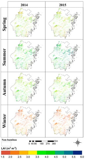 For the application of large-scale carbon cycle simulations for bamboo forest, the PF algorithm was used to assimilate the MODIS LAI time series in Zhejiang Province. The averaged LAIs of bamboo forest for each season during 2014–2015 are shown in Figure 9, and their statistical information is shown in Table 3. The LAI during the summer in 2015 was higher than that in 2014, while the LAI during other seasons in 2015 was similar to that in 2014.