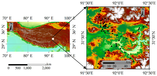 Location of the central Tibetan Plateau Soil Moisture/Temperature Monitoring Network (SMTMN) at Naqu. The black triangles indicate the in-situ soil moisture (SM) stations.