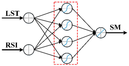 In the triangle-based SM downscaling method, the regression equation is used to simulate the relationship between SM and LST/RSI. In this research, the BPNN was used instead of regression for the relationship simulation for downscaling the microwave SM from 25 km to 1 km. The BPNN is a multi-layer neural network trained by an error back-propagation algorithm. As there is no data feedback in the network, the data workflow begins at an input layer and then consecutively moves into hidden layer(s) and an output layer with the corresponding output data. Errors between the calculated and reference output are back-propagated from the output layer to the input layer, thereby continuously updating the network weights and biases in the opposite direction so as to obtain the minimum squared errors of the network. In this research, a three-layer BPNN containing one hidden layer was used for the SM downscaling (Figure 2). The BPNN was trained by the Levenberg-Marquardt algorithm, taking the aggregated LST/RSI combination as the input and the corresponding SM at the microwave scale (~25 km) as the output. The well-trained BPNN was then applied at the MODIS scale (1 km), and thus the microwave SM products were downscaled from the coarse scale to the MODIS scale by the BPNN. The basic assumption of BPNN downscaling is that the relationship between SM and LST/RSI is scale-invariant for the both microwave- and MODIS-scale datasets. For strong nonlinear fitting, it is expected that BPNN downscaling should obtain a better result than regression downscaling. Therefore, first- and second-order regression of the triangle-based SM downscaling methods was implemented for comparison: