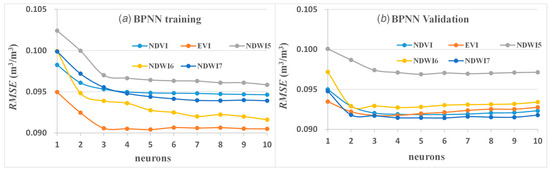 BPNN training (a) and validation (b) with various numbers of neurons. Remote sensing indexes (RSIs) indicates the land surface temperature (LST)/RSI combination.