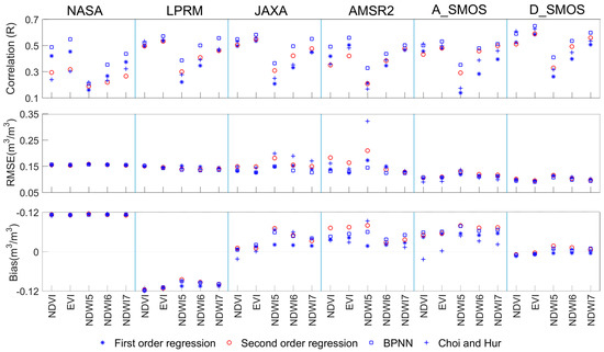 As shown in Table 3, optimal downscaling is achieved with the EVI, where the highest r is obtained for all the downscaled SM products using the different methods (in bold), with the exceptions of AMSR2 and A_SMOS for the second-order regression method and NASA and A_SMOS for the Choi and Hur method. These results suggest that LST/EVI for SM downscaling is more robust than the other LST/RSI combinations. The downscaled r of the Choi and Hur method is comparable with the regression methods but less so with the BPNN. Sorting the r values from high to low, the BPNN-downscaled SM products using the LST/EVI combination are D_SMOS (0.649), JAXA (0.582), LPRM (0.571), AMSR2 (0.558), NASA (0.547), and A_SMOS (0.531). The satisfying correlation coefficients between the BPNN-downscaled SM products and the in-situ SM data further confirm the advantage of the BPNN for SM downscaling. Therefore, the further evaluation of the BPNN-downscaled microwave SM products by the LST/EVI combination can be deemed to be credible.