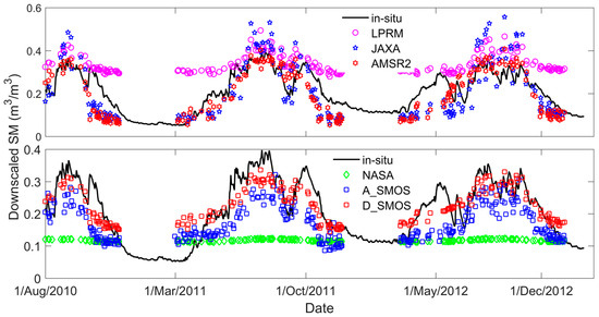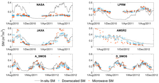 Downscaled SM products are not available for every day because of the cloud contamination. In this research, if more than 13 in-situ SM in the corresponding MODIS pixels were not contaminated, the MODIS data were regarded as cloud-free data and the valid downscaled SM over the SMTMN area was area averaged. The reason for this is that the areal mean SM of the SMTMN area can be well estimated by 13 randomly distributed in-situ SM [26]. The station-averaged in-situ SM (at 6:00 a.m.) and the area-averaged downscaled SM products at the SMTMN scale during unfrozen periods are shown in Figure 7. The temporal coverage for each downscaled SM product is shown in Table 4. Apart from A_SMOS, the other downscaled SM products have the same temporal coverage, as the same Aqua MODIS LST/EVI was used for the SM downscaling. The downscaled NASA product is generally stable, and all the SM values are around 0.12 m3/m3. The RMSE (0.134 m3/m3) and bias (0.109 m3/m3) of the downscaled NASA product are quite high, which shows that significant errors exist in the downscaled NASA product. Both the time series analysis (Figure 7) and the statistical assessment of the negative bias indicate that the SM value is significantly overestimated by the downscaled LPRM product. Nevertheless, the downscaled LPRM product has a higher r (0.777) and lower RMSE (0.124 m3/m3) than the downscaled NASA product. The downscaled JAXA and AMSR2 products show similar temporal variations. The downscaled AMSR2 product has a lower RMSE (0.076 m3/m3) and is slightly better than the downscaled JAXA product, which contains some spurious high SM points during the summer period. As for SMOS, the downscaled A_SMOS product is generally underestimated, and the downscaled D_SMOS product is closer to the in-situ SM observations. The fact that the downscaled D_SMOS product is better than the downscaled A_SMOS product has also been noted in previous studies [4,19].
