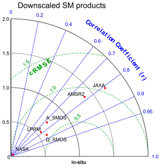 The discrete distribution of the downscaled SM products is also illustrated in Taylor diagrams (Figure 8). The downscaled SMOS products are quite close to the in-situ observation and have a lower RMSE than the downscaled AMSR product (Table 4). The downscaled D_SMOS product has the highest r among the downscaled microwave products. SMOS is designed specifically for SM observation and deploys the L-band, which is better than the C- or X-band for SM retrieval [35]. Thereby, the downscaled SMOS product generated from the SMOS microwave-scale SM product can achieve a better result. The variability of the downscaled D_SMOS product is the closest to the in-situ SM data, with the best result (r = 0.859, RMSE = 0.052 m3/m3, and bias = −0.011 m3/m3) at the SMTMN scale among the downscaled SM products (Figure 8 and Table 4).