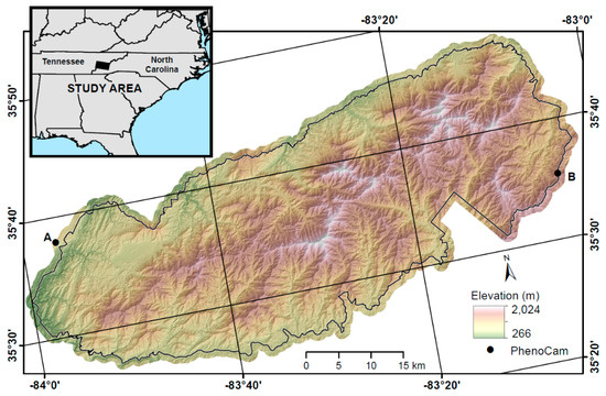 Location of the Great Smoky Mountains National Park study area with respect to the Southeastern USA. Dots show the location of the Smokylook (A) and Smokypurchase (B) PhenoCams used in this study.