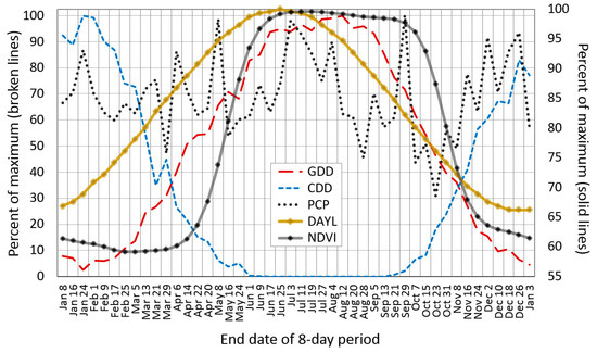 DAYL steadily increases from January, preceding the increase in GDD by about a month in early spring, then DAYL begins to fall 3–4 weeks prior to GDD in late summer. In turn, NDVI lags GDD by an additional 3–5 weeks in early spring, and about four weeks in early autumn. In late summer, CDD begin to accumulate about three weeks after GDD begins to decline, with NDVI falling as CDD rises through the autumn. CDD continue to accumulate through the winter, peaking in early February, roughly midway between the winter solstice and spring equinox, with the majority of its decline occurring well before the visible start of the growing season across GRSM, which is mid-April. Minimum NDVI typically occurs in the weeks immediately after the peak in CDD from late February or early March. Peak NDVI occurs in July, soon after maximum DAYL, but well before GDD peaks in early August. Average PCP is highly irregular at eight-day resolution, but PCP dips in October as NDVI is falling.