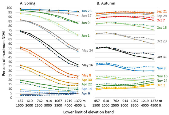 To describe the influence of topography on the timing of spring and autumn phenological transitions, elevation and slope parameters were calculated for every MODIS cell. Solar radiation, a surrogate for slope aspect and its associated dryness, was calculated for the summer equinox (21 June) with a 30 m digital elevation model using the Solar Radiation tool in ESRI’s ArcMap and assigned relative values from 1 to 100 [65]. Indexed solar radiation values were up-scaled to MODIS resolution using the mean neighborhood value in a 240 m moving window, then binned into three evenly represented classes based on the distribution of values within the Park (i.e., relatively xeric, moderate, or mesic). Elevation was binned into 152 m (500 ft.) classes from 457 to 1676 m (1500 to 5500 ft.). Because NDVI varies by vegetation type and topography, values were transformed into a Percent Completion metric, expressed as the percentage of the range between the average 2000–2015 summer maximum and winter minimum NDVI represented by the current NDVI for each MODIS cell. These Percent Completion NDVI values were summarized for each combination of elevation band and xeric/mesic class through spring and autumn to show the relative impacts of slope and elevation on phenology as these seasons progressed.