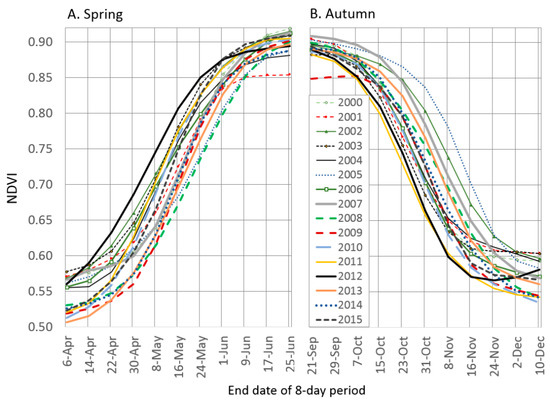 Correlations between mid-autumn NDVI (for the period ending 31 October) and lagged GDD are strongly positive for 29 September and 15 October, with a predictable inverse pattern with CDD (Figure 6D,E). A cross-seasonal association is suggested between late autumns (i.e., higher autumn NDVI) and cool springs (i.e., more CDD) for the period ending 8 May. As seen with lagged PCP in the spring, fall PCP shows a weak relationship with autumn NDVI (Figure 6F).