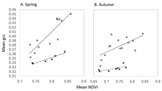 Correlation between spring (A) and autumn (B) NDVI and greenness captured by the Smokylook (dotted line, open circles) and Smokypurchase (dashed line, crosses) PhenoCam. NDVI values are the average for all deciduous forests in the Park within a 100 m elevation band centered on the PhenoCam elevation.