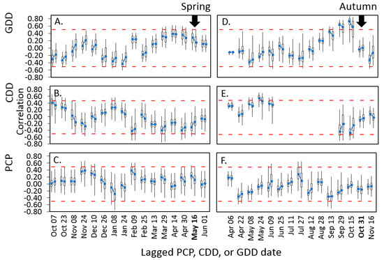 Correlations of mid-spring and mid-autumn NDVI with antecedent weather: (A) Correlation of spring NDVI with growing degree days (GDD); (B) spring NDVI with chilling degree days (CDD); (C) spring NDVI with precipitation (PCP); (D) autumn NDVI with autumn GDD; (E) autumn NDVI with autumn CDD; and (F) autumn NDVI with autumn PCP. Spring weather variables are lagged by two eight-day periods and the autumn variables are lagged by four periods compared to NDVI (see Figure 6 for context).