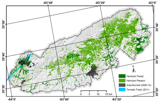 Areas of known blowdown, fire and insect-induced tree mortality within Great Smoky Mountains National Park, 2000–2015.