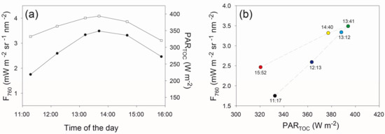 - Amoros-Lopez, J.; Gomez-Chova, L.; Vila-Frances, J.; Alonso, L.; Calpe, J.; Moreno, J.; del Valle-Tascon, S. Evaluation of remote sensing of vegetation fluorescence by the analysis of diurnal cycles. Int. J. Remote Sens. 2008, 29, 5423–5436. [Google Scholar] [CrossRef]