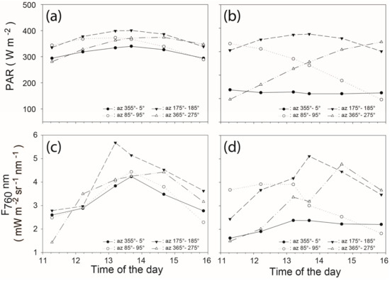 4.3. Spatio-Temporal Variations of F760 as a Function of the Leaf Orientations and the Viewing Geometry
