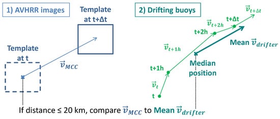 Figure 1. Schematic illustration of the two methods to estimate ocean surface currents: (1) using the maximum cross correlation (MCC), determining the displacement of a template window between two consecutive Advanced Very High Resolution Radiometer (AVHRR) images separated by Δ t ; (2) using the drifters, averaging the hourly drifter velocities over Δ t .