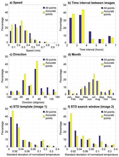 Figure 3. For all the points that are compared (dark blue) and the points accurate both in speed and direction only (yellow), histograms representing the split of these points (as a percentage) according to (a) the MCC speed; (b) the time interval between the two images used for the MCC; (c) the MCC direction; (d) the month when the images were taken; (e) the standard deviation of the normalized brightness temperature of the template; and (f) that of the search window. For all subpanels, the values have been divided into intervals so that each bar represents all values within that interval.