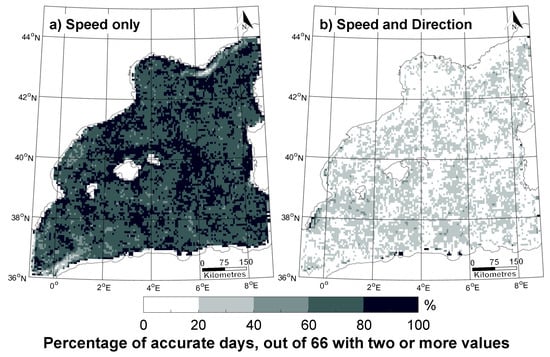 Figure 4. Maps of the western Mediterranean Sea showing for each grid cell the percentage of days with more than two MCC values (total 66) which differ from the reanalysis values by (a) less than 0.2 m s 1 in speed, and also (b) less than 45 in direction.