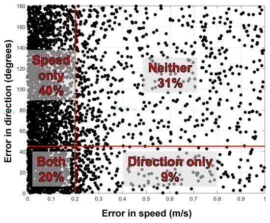 The first characteristic that we test is the location of the retrieval. Our study area covers approximately 500,000 km 2 of ocean and features distinct surface current patterns [19], yet the accurate points do not seem to be limited to a specific region (orange dots, Figure 2). They are also not consistently limited to a specific distance from the coast. For example, the Algerian coast to the south is data-poor, and mostly has points that are only accurate in speed (green dots, Figure 2). The Spanish coast to the west and the Sardinia coast to the east are data-rich and feature all types of points within a few kilometres from each other. Accurate points are encountered both in the open ocean and close to the coast.