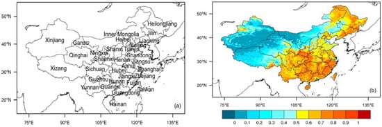 (a) The provincial administrative regions in China and (b) spatial patterns in the climatological Normalized Difference Vegetation Index (NDVI) averaged from 1982 to 2012.