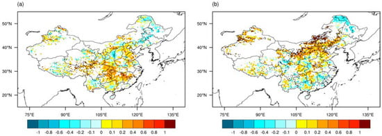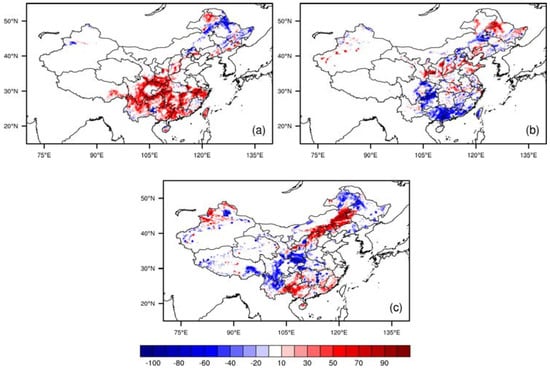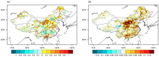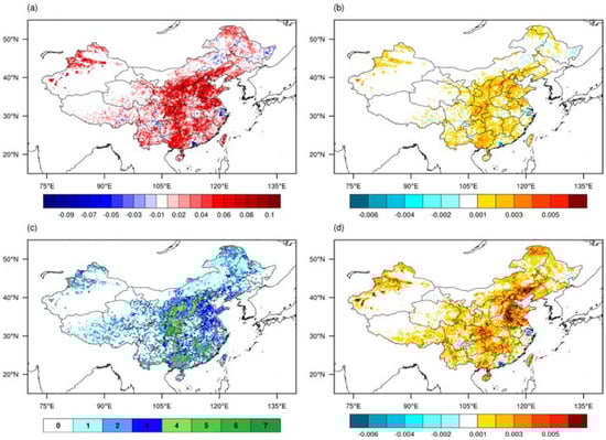 The above NDVI changes are not only influenced by climate variations, but also by human activities such as LUC. Next we quantify the relative contribution of climate and non-climatic effects using MLR. We first examine how climatic variations are linked to the NDVI changes. Figure 5a–c show the regression coefficients of NDVI associated with the three climatic variables. Positive significant relationships between NDVI and temperature are found over most of South China, except for the northwestern and northeastern regions such as Heilongjiang Province, indicating that temperature is the most significant climatic factor contributing to the increased vegetation growth. However, vegetation changes in most semi-arid and arid regions are highly sensitive to changes in precipitation []. Figure 5b shows that precipitation dominantly controls the variations in NDVI in the growing season over northwestern and northern China. Thus, warming can enhance vegetation growth over temperature-limited ecoregions but has the opposite effect on water-limited semi-arid and arid ecosystems []. The NDVI in central China and parts of the Hetao Region and Guangxi has the greatest positive correlation with radiation, but is negatively correlated with radiation in southern China (Figure 5c). These results indicate that the vegetation-climate relationships are highly heterogeneous across China and that the major climatic drivers for the NDVI changes differ by geographical location and vegetation type. It is also noteworthy that for regions in central China (Figure 2) where the greening trend is significant, the relationships between NDVI and climate variables (temperature, precipitation, and radiation) are insignificant, implying limited climatic impacts.