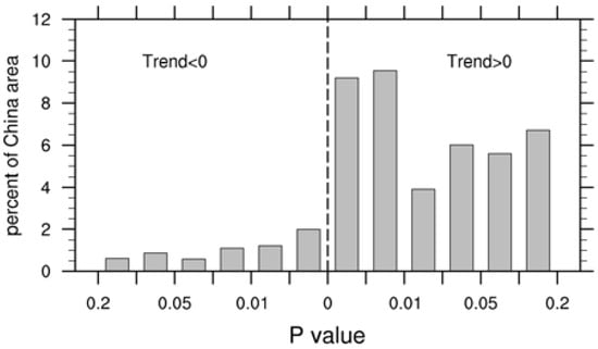 Histograms of NDVI trends shown in Figure 2b as a function of p values in China.