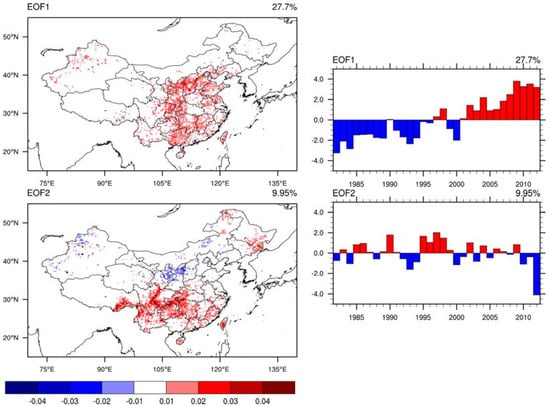 We further examine the spatiotemporal patterns of NDVI changes over China by conducting an EOF analysis. Figure 4 shows the eigenvectors and associated principal components (PCs) for the first two leading EOF modes. The first EOF mode, which represents 27.7% of the total variance, shows positive values in southern and central China and part of the North China Plain that are consistent with the NDVI changes shown in Figure 2. The time series of the first PC represents decadal variations and shows an increasing trend since 2000. Peng et al. [] noted that significant changes in the growing season NDVI occurred in the 1990s and early 2000s over northern China (e.g., Inner Mongolia and North China). We therefore separate the study period into two parts to examine how the vegetation growth differs. After calculating the NDVI trend before 2000 (1982–1999) and from 2000 on (2000–2012), we see large increases in the NDVI after 2000 in the Ningxia Hui Autonomous Region, north of Shaanxi, and Shanxi Provinces, where the trends in NDVI are not pronounced from 1982–1999 (i.e., the Loess Plateau, Figure 2d). The second EOF mode, which explains approximately 10% of the total variance, denotes the reverse spatial patterns in NDVI changes between the southern and northern areas. The time series of the second PC generally has a 1-3 year cycle from 1982 to 2012 and has strong variations in NDVI in the 1990s. Studies have shown that the decrease in the growing season NDVI after the 1990s in the arid and semi-arid regions of northern China could be attributed to climate change, i.e., drought stress strengthened by warming and reduced rainfall [,]. As the growing season NDVI significantly differs in the 1990s based on the trend and EOF analysis, and the data temporal coverage differs among the different products, our focus will be on the period starting from 1992 onward when most observations are available.