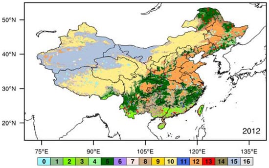 Previous modeling studies indicated that LUC drives the long-term changes in vegetation greenness [,,]. Before quantifying LUC, we first show the main vegetation cover map in China (Figure 6). South China consists primarily of forests, such as mixed forests and evergreen broadleaf and needleleaf forests. Croplands are mostly found in north, northeast China, and Sichuan province, whereas grasslands are in Inner Mongolia, the Hetao region, and the Tibetan Plateau. Comparing with croplands and grasslands, forests basically have more leaves per unit ground surface area and thus higher vegetation index values, particularly in north China (Figure 1a). For simplicity, we combine all forest classes from classes 1 to 5 (referred to as forests), and all classes of grasslands, shrublands, and savannas from classes 6 to 10 (referred to as grasslands), because each group shares similar NDVI values in China (see more discussion of this below).